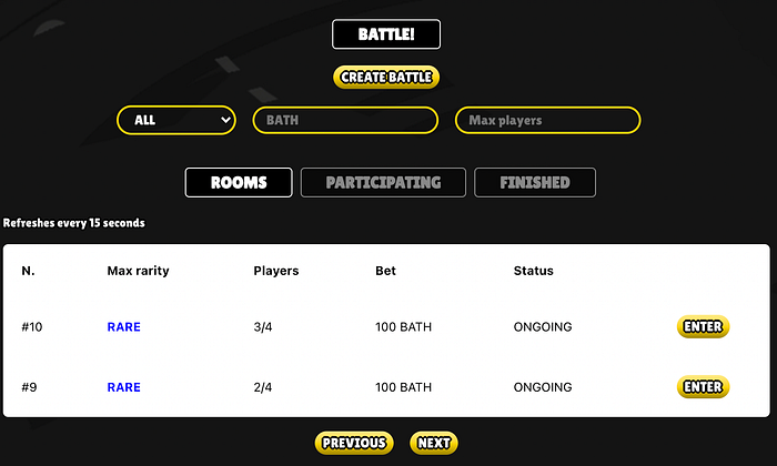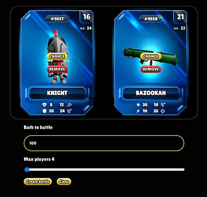 Te imaginas esos típicos días que no tienes buen AIM, que no te apetezca jugar… o que directamente no seas un jugador, pero te apetezca vivir la experiencia P2E. De esta idea nacen las batallas en la DAPP, donde ofrecemos una alternativa al juego convencional respetando las estadísticas de tus NFTS. En estas batallas podrás simular una lucha de forma descentralizada. Pero no solo eso, además tú y solo tú, serás el encargado de crear esos combates, y donde tú y solo tú, elegirás las normas. Para que quede aún más claro, serás tú quien decida cuál será la rareza mayor, el número de personas que participarán y cuanto BATH será la entrada para la batalla. Una vez generada la sala, cualquier otro jugador podrá entrar para pelear.